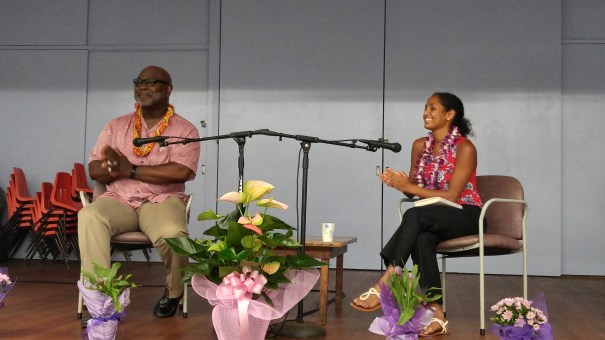Dr. Willie Parker, pictured here with fellow obstetrician-gynecologist Dr. Shandhini Raidoo, in conversation at the book signing at the Church of the Crossroads in Honolulu on July 27. Parker is a Christian who argues that the slogan “life begins at conception” is not founded in fact.